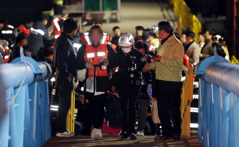 [신안 세계타임즈 = 우덕현 기자] 19일 오후 전남 목포시 목포해양경찰서 전용 부두로 여객선 퀸제누비아2호 탑승객들이 구조돼 이동하고 있다.