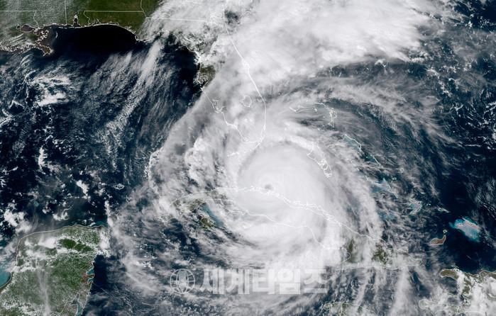 허리케인 어마가 9일(현지시간) 거대한 소용돌이를 일으키며 플로리다로 향하고 있는 모습이 GOES-16 위성에 포착됐다. 사진은 미국립해양대기청(NOAA)이 제공했다. 2017.09.10