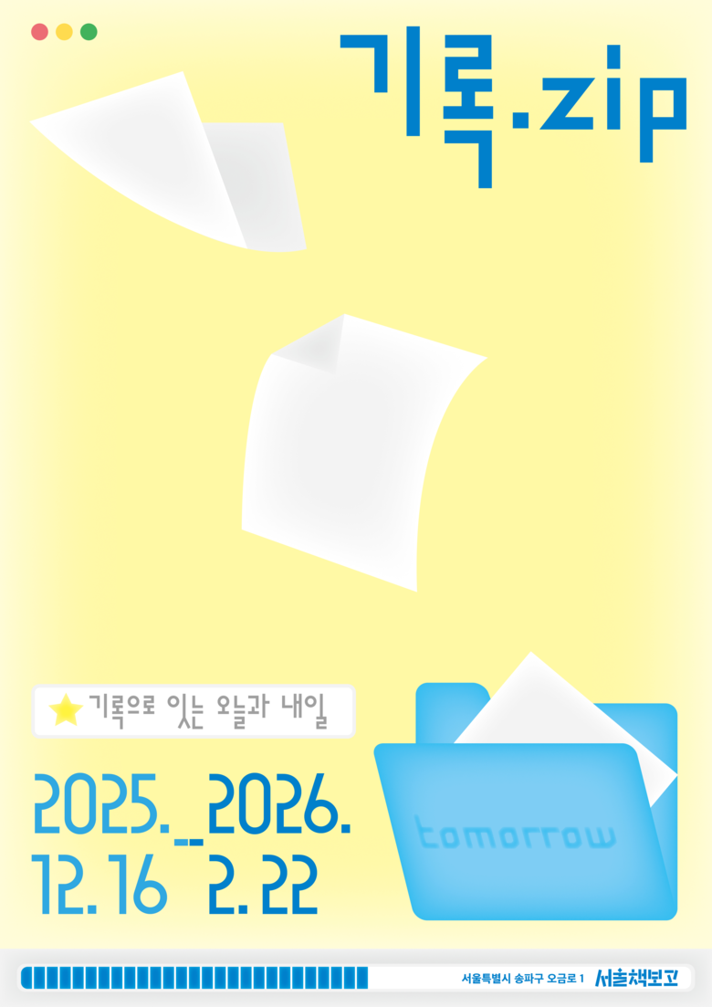 먼저 서울책보고는 12월 16일(화)부터 내년 2월 22일(일)까지 ‘형형색책(形形色册)’ 네 번째 시리즈 <기록.zip : 기록으로 잇는 오늘과 내일>을 개최한다. 이번 프로그램은 ‘기록’을 대주제로 삼아, 지나온 시간을 회고하고 다가올 내일을 준비하는 다양한 전시와 행사로 구성됐다.