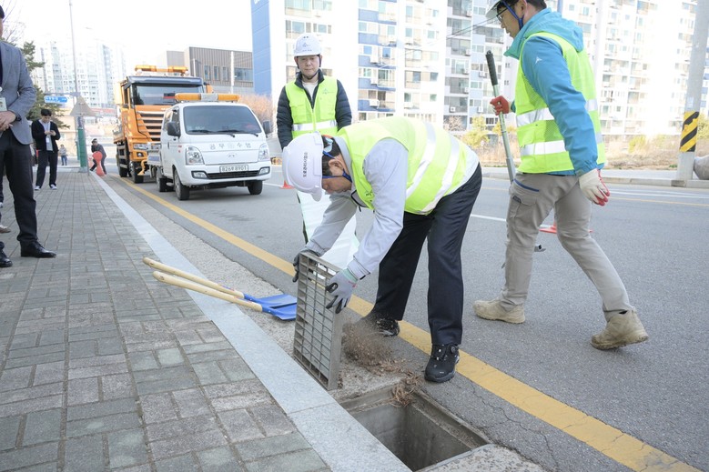 우선 최민호 시장은 도로 정비 현장의 배수구 덮개를 열고 내부에 쌓인 이물질을 제거하면서 도로보수원의 업무를 도왔다.