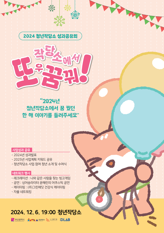 [부산 세계타임즈=이용우 기자] 부산시(시장 박형준)는 오늘(6일) 오후 7시 청년작당소(중구 소재)에서 올해의 성과를 돌아보고 내년의 비전을 공유하는 2024년 청년작당소 성과공유회 '작당소에서 또우 꿈 꿔'를 개최한다고 밝혔다.