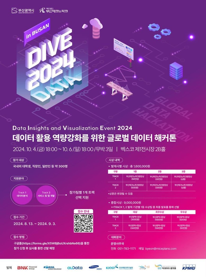 부산시(시장 박형준)는 오는 4일부터 6일까지 3일간 벡스코에서 '글로벌 데이터 해커톤 대회' 「다이브(DIVE) 2024」를 올해 처음 개최한다고 밝혔다.