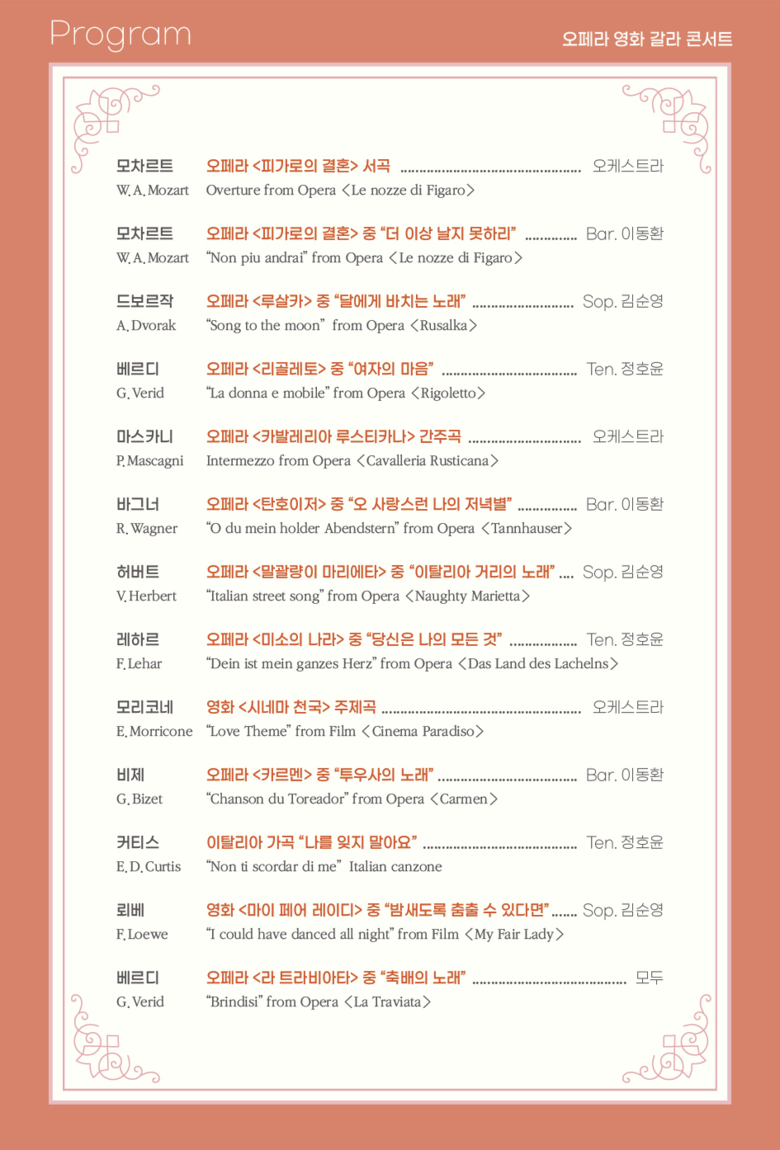 이날 공연에는 모차르트, 베르디, 바그너, 비제 등 세계적 작곡가의 오페라 <피가로의 결혼>, <리골레토>, <카르멘>, <라 트라비아타>의 아리아와 영화 <시네마 천국> 등의 영화음악 연주곡이 펼쳐질 예정이다.