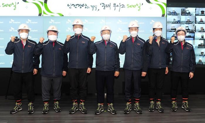 SK에코플랜트는 지난 9일 서울 종로구 지플랜트(G.plant) 사옥에서 ‘중대 무사고 500일 달성 기념행사’를 개최했다고 10일 밝혔다. 이날 행사는 온라인 화상시스템을 활용해 국내외 현장에서 안전을 책임지고 있는 현장소장 및 구성원 200여명이 참여했다.
