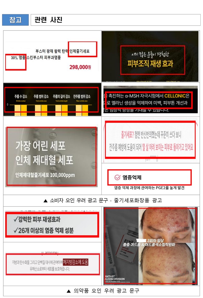 '가' 업소는 줄기세포 관련 화장품의 경우 줄기세포 배양액이 아닌 줄기세포가 들어 있는 것으로 소비자가 오인할 수 있는 광고는 할 수 없음에도 불구하고 '인체 줄기세포 30퍼센트(%) 앰플, 주름수 감소, 주름범위 감소, 주름길이 감소, 손상된 피부세포의 재생효과, 미백' 등의 표현으로 줄기세포 배양액이 포함된 화장품을 마치 줄기세포가 들어가 피부 재생 효과와 주름 개선, 미백 등 효능이 있는 것처럼 거짓·과대 광고를 하다가 적발됐다.