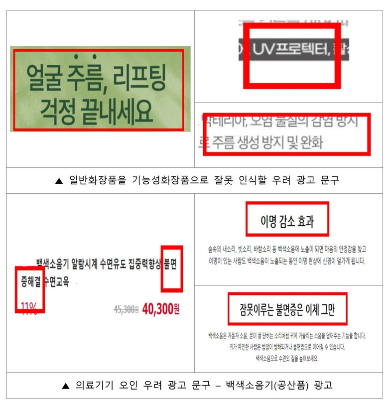 적발된 위법행위는 ▲소비자를 속이거나 소비자가 잘못 인식할 우려가 있는 광고(5건) ▲화장품을 의약품으로 부당하게 광고(3건) ▲기능성화장품이 아닌 화장품을 기능성화장품으로 잘못 인식할 우려가 있는 광고(2건) ▲의료기기가 아닌 것을 의료기기로 잘못 인식할 우려가 있는 광고(1건) 등이었다.