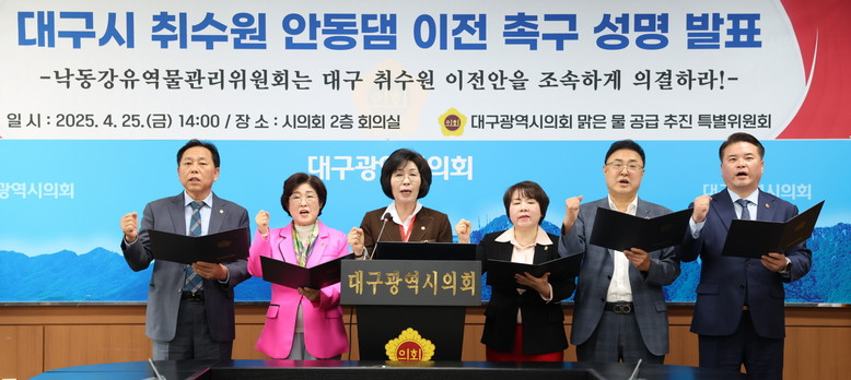 [대구 세계타임즈=한윤석 기자] 대구광역시의회 ‘맑은 물 공급 추진특별위원회(위원장 박종필, 이하 특위)’는 4월 25일(금), 시의회 2층 회의실에서 성명을 통해 정부 낙동강유역물관리위원회에 ‘대구 취수원 이전안’의 조속한 의결을 촉구했다.