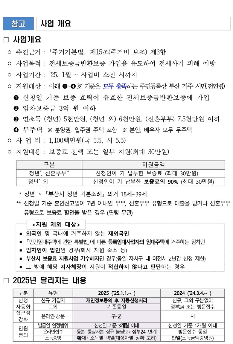 [부산 세계타임즈=이용우 기자] 부산시(시장 박형준)는 내년(2025년)에도 '전세보증금 반환보증 보증료 지원사업'을 계속 추진하며, 내일(1일)부터 접수를 시작한다고 밝혔다.