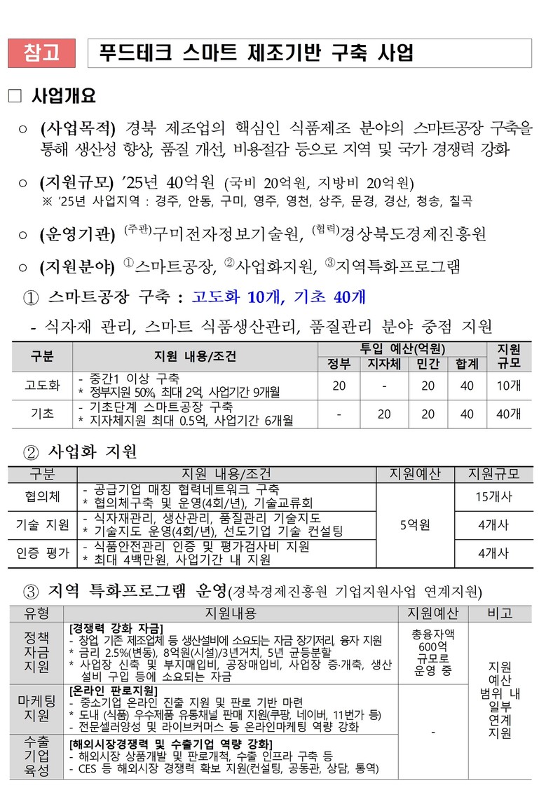 경북도에서는 2025년부터 2026년까지 식품 제조 분야 기업을 대상으로 스마트 식품공장 50개 사(기초 40개, 고도화 10)에 40억원을 지원할 계획으로 이를 통해 식자재 관리, 스마트 생산관리, 품질관리 등 다양한 분야에서 첨단 스마트공장 시스템을 구축할 방침이다.