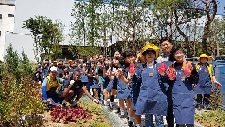 | ▲ )2024년 5월 수원FC위민 선수를 비롯한 참가자들이 손바닥정원 조성 후 기념촬영을 하고 있다. |