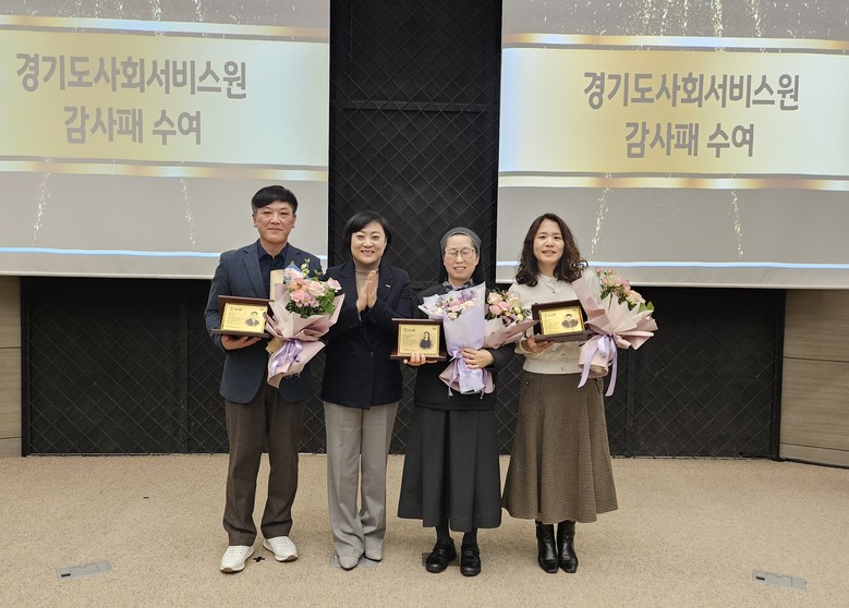 ▲경기도사회서비스원 안혜영 원장(왼쪽 두 번째)이 경기도사회서비스원 감사패 전달 이후 기념사진을 촬영 중이다.(사진=경기도사회서비스원)