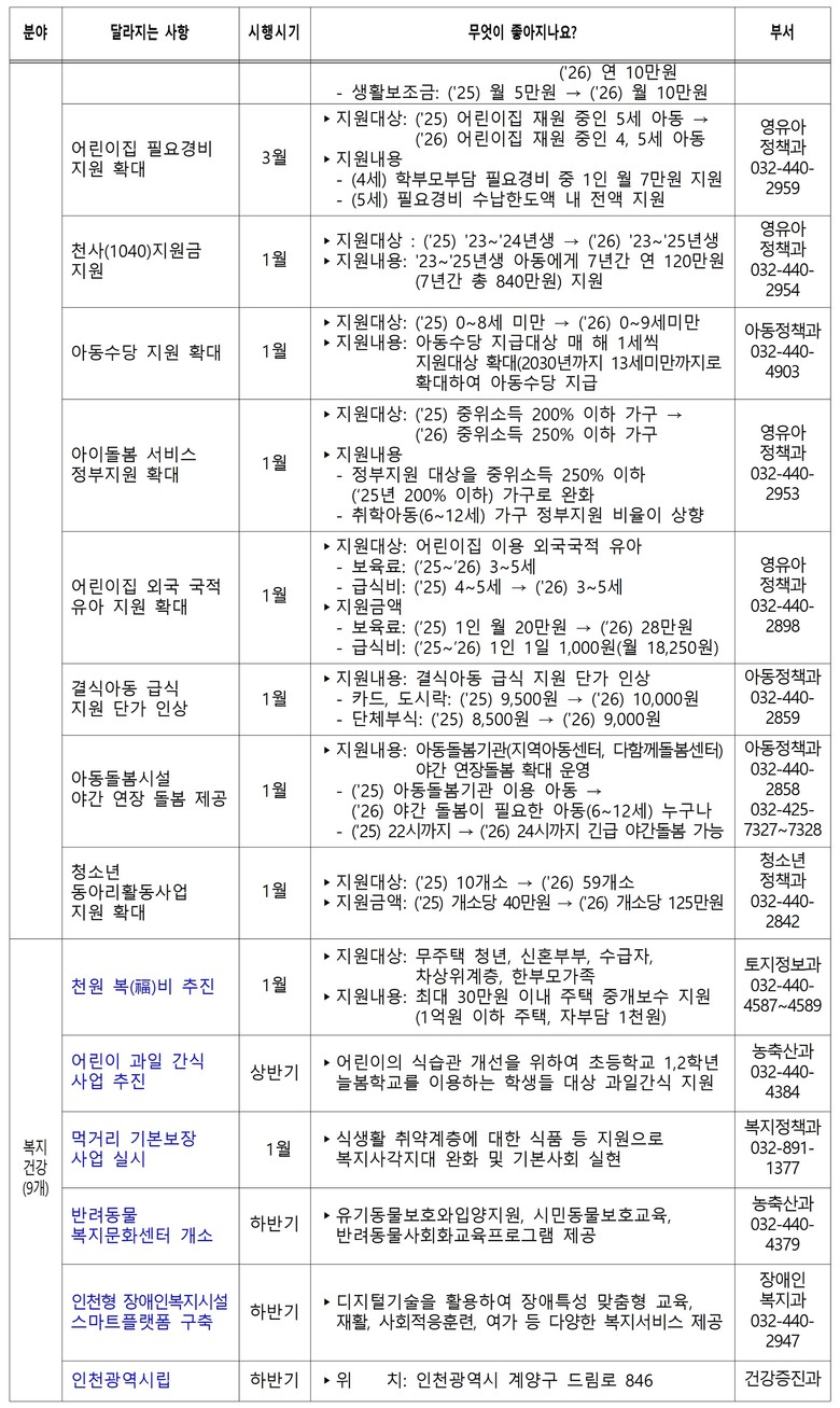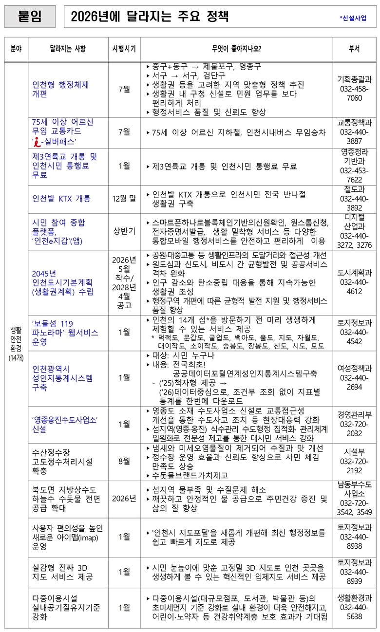 인천시는 2026년 달라지는 주요 정책과 변화되는 시민 생활을 한눈에 확인하고 활용할 수 있도록 책자 "2026, 더 좋아지는 인천생활”을 발간해 온·오프라인으로 제공할 계획이다.