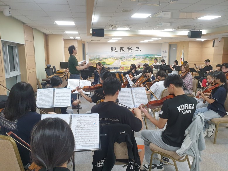 ▲ 꿈쟁이오케스트라가 팔달구청 대회의실에서 합주 연습을 하고 있다. |