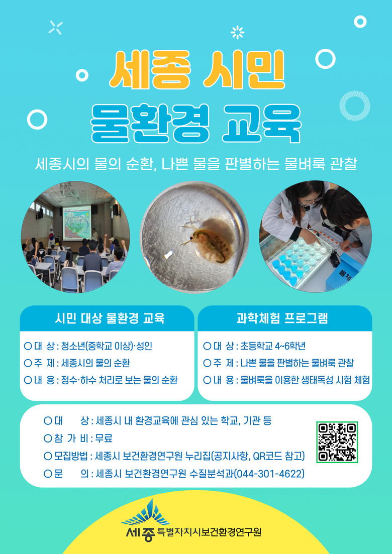 교육은 ▲세종시의 물의 순환 ▲나쁜 물을 판별하는 물벼룩 관찰 교실 등 두 가지 프로그램으로 운영된다.