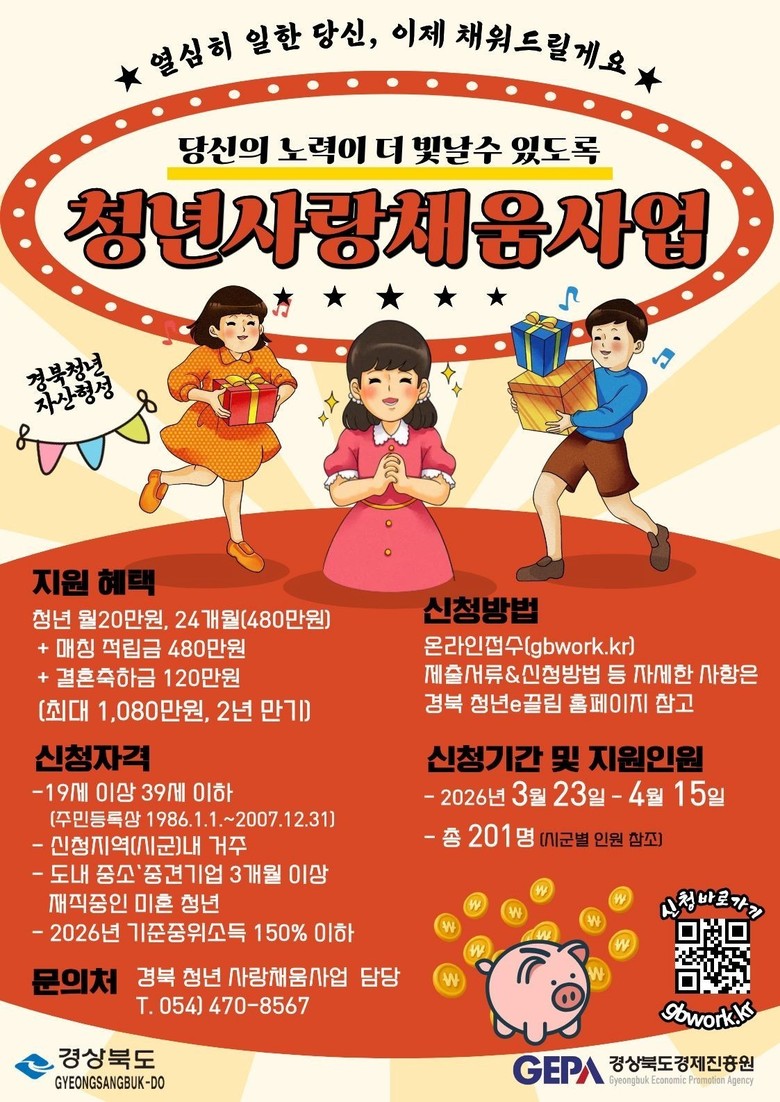 ‘경북 청년 사랑채움사업’은 중소‧중견기업 재직 미혼 청년근로자의 자산형성을 지원하기 위해 청년이 2년간 480만 원을 적립하면 동일한 금액의 매칭 지원금 480만 원을 추가로 적립해 주며, 또한 가입기간 중 결혼 시 120만 원의 결혼축하금을 추가 지원하여 최대 1,080만 원과 이자를 수령할 수 있다.