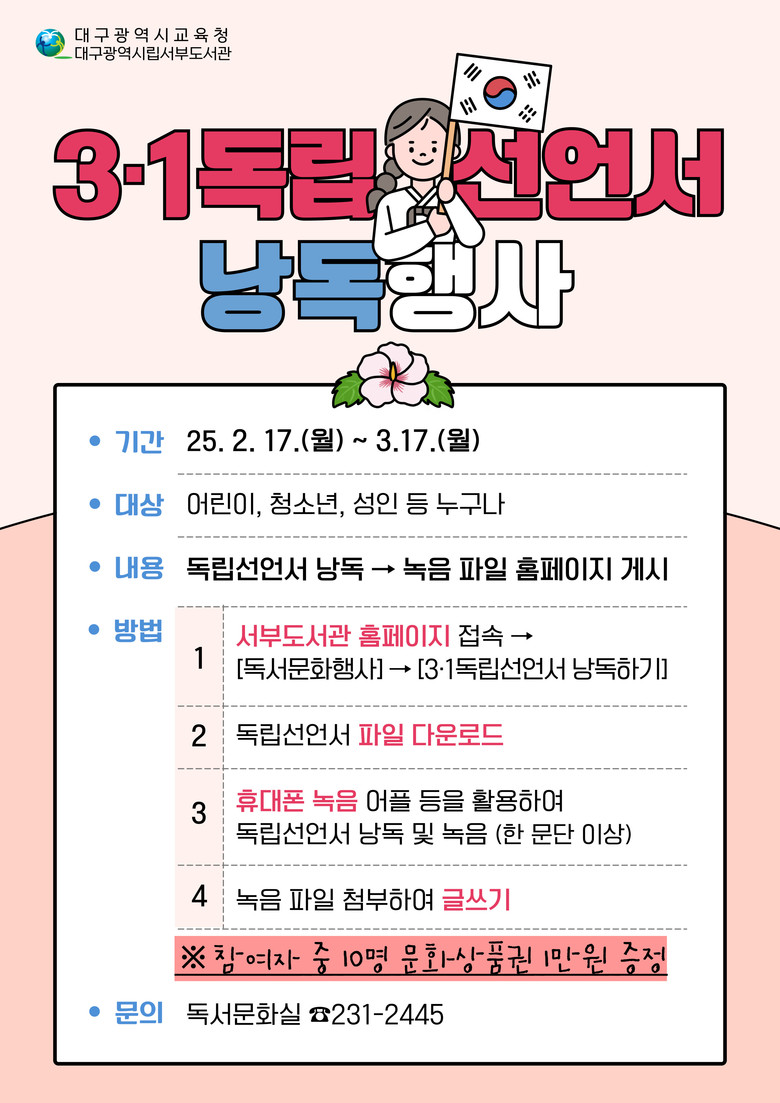 독립선언서를 낭독하고 그 녹음 파일을 도서관 누리집(library.daegu.go.kr/seobu/독서문화행사/3.1독립선언서 낭독하기)에 게시하면, 참여자 중 10명을 추첨해 문화상품권을 증정한다.