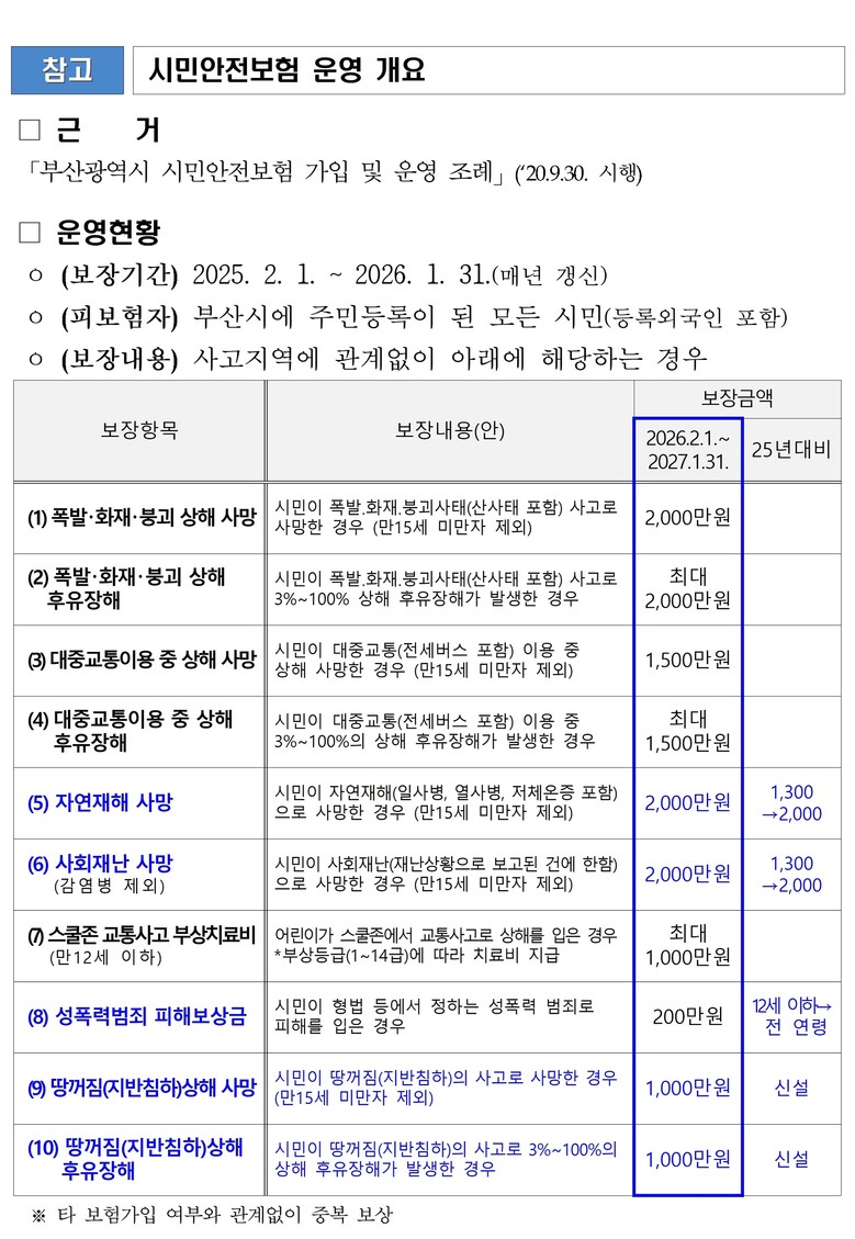 내년(2026년) 2월부터 부산 시민은 ▲땅꺼짐(지반침하) 상해 사망 및 후유장해 ▲폭발·화재·붕괴·산사태 상해 사망 및 후유장해 ▲대중교통 이용 중 상해 사망 및 후유장해 ▲스쿨존 교통사고 부상치료비 ▲자연재해 사망 ▲사회재난 사망 ▲성폭력범죄 피해보상금 등 총 10개 항목을 시민안전보험으로 보장받을 수 있다. ※ 상세 보장내용 붙임 참고
