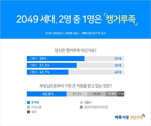 벼룩시장구인구직(20~40대 성인남녀 1599명 대상)의 조사에 따르면, 응답자의 51.3%가 본인은 ‘캥거루족’이라고 생각한다고 답변했다. 캥거루족은 성인이 됐음에도 부모에게 경제적‧정신적으로 의존하는 이들을 의미한다.