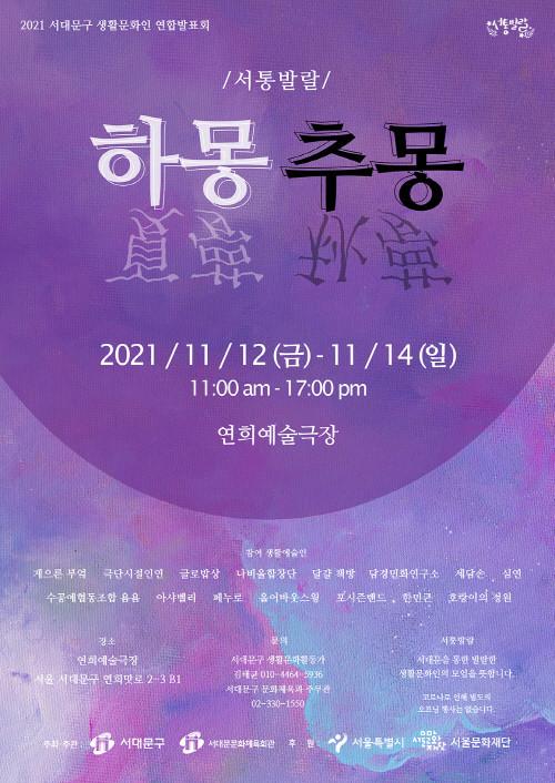 서대문구 관계자는 “이번 전시에서 서대문구 생활문화인들의 기량과 활동 모습을 발표하고자 한다”며 “코로나로 인해 즐기지 못했던 문화예술을 이번 기회에 오셔서 꼭 감사하시고 마음에 위안과 즐거움을 얻어가셨으면 한다”고 말했다.