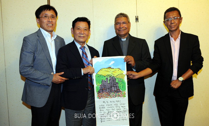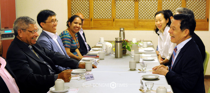 △윤장현 광주광역시장이 시내 한 음식점에서 동티로르 까를루스 벨로 주교, 일리디오 노동부장관 등과 만찬을함께 하며 민주·인권 연대 등 상호 관심사를 논의 하고 있다 |