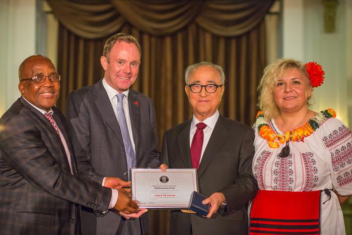 | ▲23일 네덜란드 헤이그에서 열린 제13회 고촌상 시상식에서 기념촬영을 하고 있는 (왼쪽부터) 아론 못소알레디(Aaron Motsoaledi) 남아프리카공화국 보건복지부 장관, 닉 허버트(Nick Herbert) 세계결핵퇴치의원연맹 대표, 종근당고촌재단 김두현 이사장, 루치카 디띠우(Lucica Ditiu) 결핵퇴치 국제협력 사업단 사무국장 |
