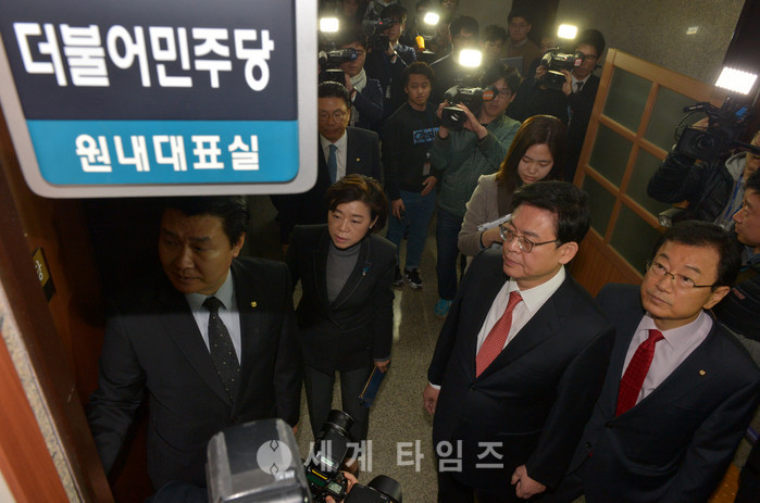 새누리당 정우택 원내대표가 20일 오전 서울 여의도 국회에서 더불어민주당 우상호 원내대표를 예방했으나 만나지 못하고 있다. 2016.12.20.