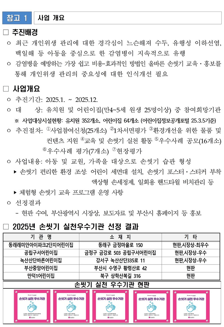 한편, 「손씻기 실천 우수사업」은 유아를 대상으로 한 체험형 교육과 손씻기 환경 개선을 통해, 평생 이어질 손씻기 습관 형성을 지원하는 사업이다.