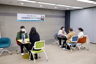 사람들이 미국이과 대화하기 위해 몰려있어요.