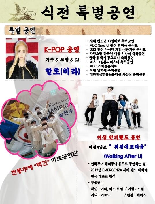 1부에서는 ▲전통무예택견 미르공연단 ▲파격적인 퍼포먼스와 가창력 자랑하는 k-pop 가수 히라 ▲파워풀 샤우팅 강력한 드러밍으로 귀를 즐겁게 해주는 보컬 파격적인 보이스 ‘워킹에프터(여성 4인조 인디밴드)’ 등이 축하공연의 막을 올린다.