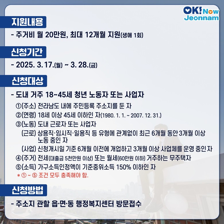 지원 대상은 무주택자로서 신청일 현재 전남에 주소를 두고 전세 5천만 원 이상 또는 월세 60만 원 이하의 주택을 임차해 거주하는 일하는 청년(1980~2007년 출생자)이다.