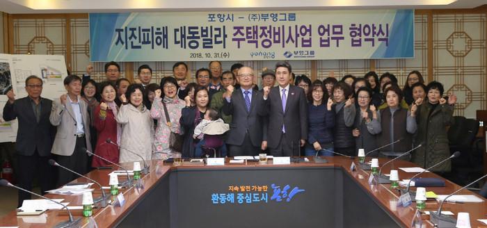 지난해 지진 피해가 발생한 포항 지역 이재민들을 위해 아파트 52가구를 제공, 큰 도움을 제공한 부영그룹이 이번엔 주거환경을 개선하고, 보금자리를 잃은 이재민들의 장기적인 주거안정을 위해 피해 지역을 재건하는 정비사업을 공동 추진키로 하고 31일 포항시와 업무협약을 체결했다.