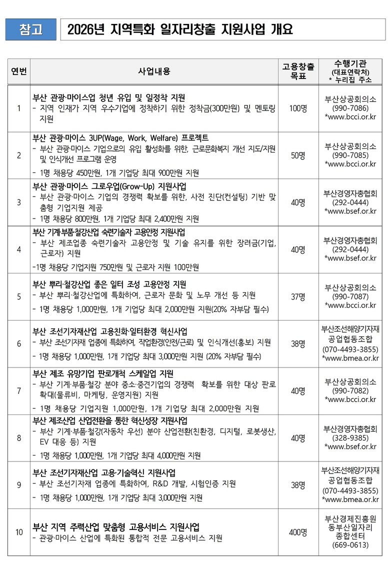 [부산 세계타임즈=이용우 기자] 부산시(시장 박형준)는 지역 산업의 경쟁력을 높이고 양질의 일자리를 확대하기 위해 「2026년 지역특화 일자리창출 사업」을 본격 추진한다고 밝혔다.