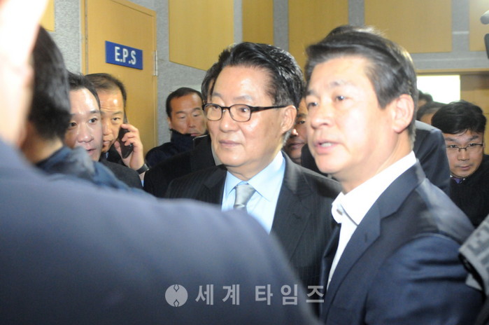 13일 전북도의회에서 국민의당 '전북지역 순회 최고위원회의'가 개최된 가운데 박지원 대표가 회의장 밖에서 항의하는 장성민 전 의원의 지지자들을 피해 지하 계단으로 빠져 나가고 있다. 이날 장 전 의원의 지지자들은 장 전 의원의 입당을 보류한 국민의당 지도부를 강하게 규탄했다. 2017.02.13.