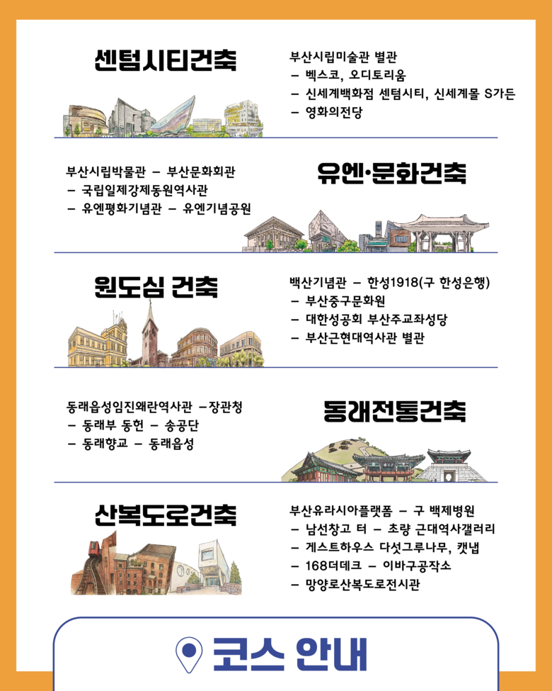 건축투어에는 부산의 대표적인 도시·건축문화자산으로 구성된 ▲센텀시티건축(해운대구) ▲유엔·문화건축(남구) ▲원도심건축(중구) ▲동래전통건축(동래구) 코스가 있으며, 작년 5월 새롭게 선보인 ▲산복도로건축(동구)까지 더해 총 5개 코스를 운영한다.