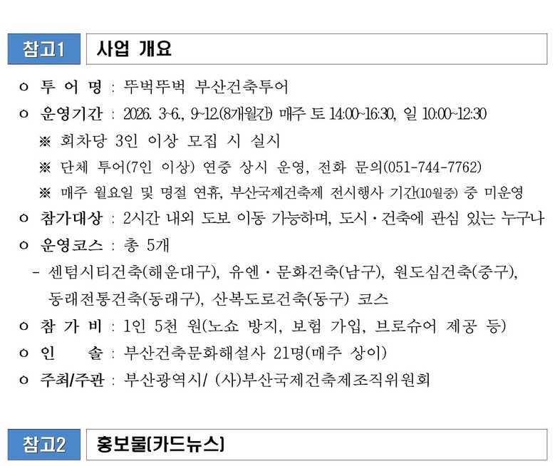 배성택 시 주택건축국장은 “부산에는 도시의 역사와 정체성을 담은 다양한 건축자산이 곳곳에 자리하고 있다”라며, “이번 '뚜벅뚜벅 부산건축투어'를 통해 시민들이 건축에 담긴 이야기를 걸으며 경험하고 부산 건축문화의 매력을 발견하는 계기가 되길 기대한다”라고 전했다.