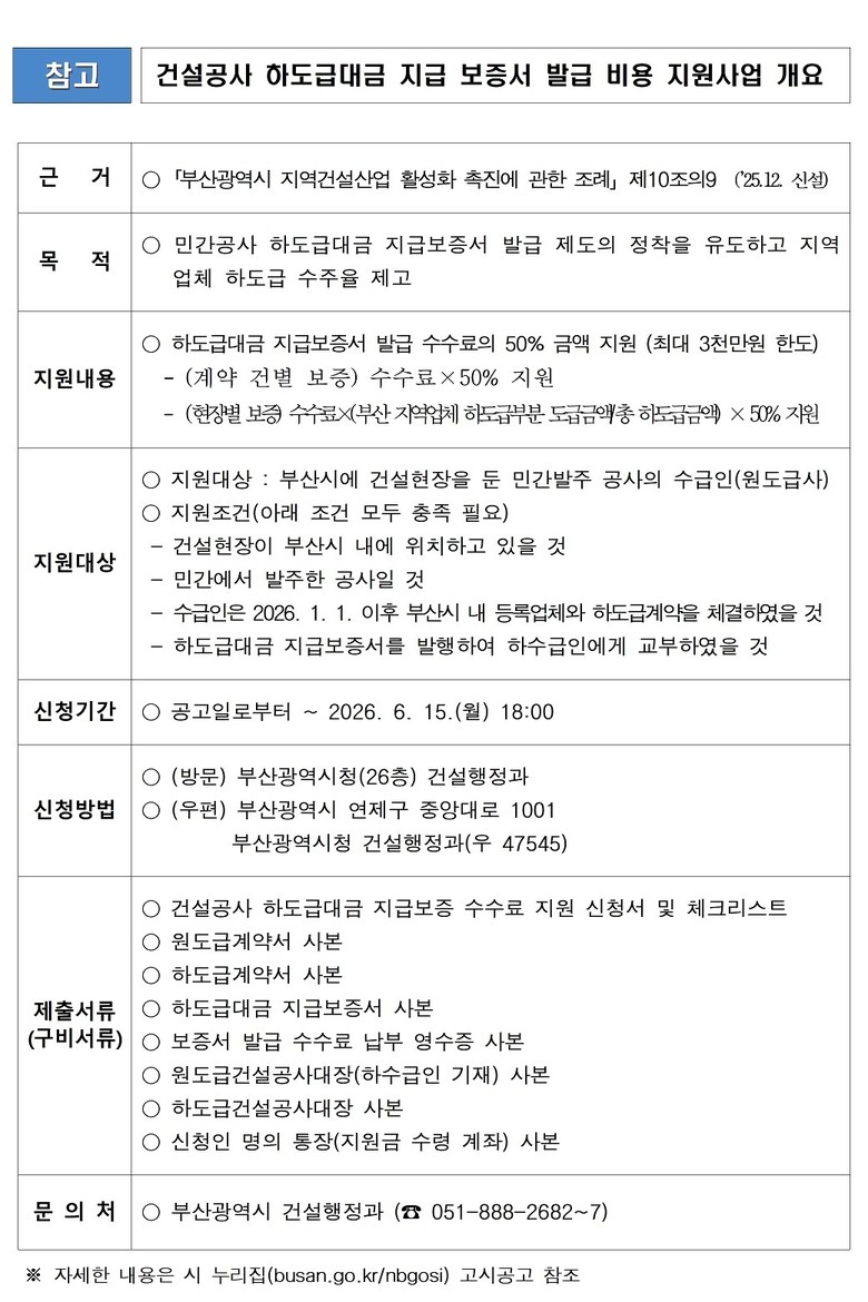 ◈ ▲[지원 대상] 2026.1.1. 이후 시역 내 민간 건설공사 현장에서 부산 지역 건설업체와 신규 하도급계약을 체결한 원도급사 ▲[지원 금액] 하도급대금 지급보증서 발급 수수료의 50퍼센트(%), 업체당 최대 3천만 원까지