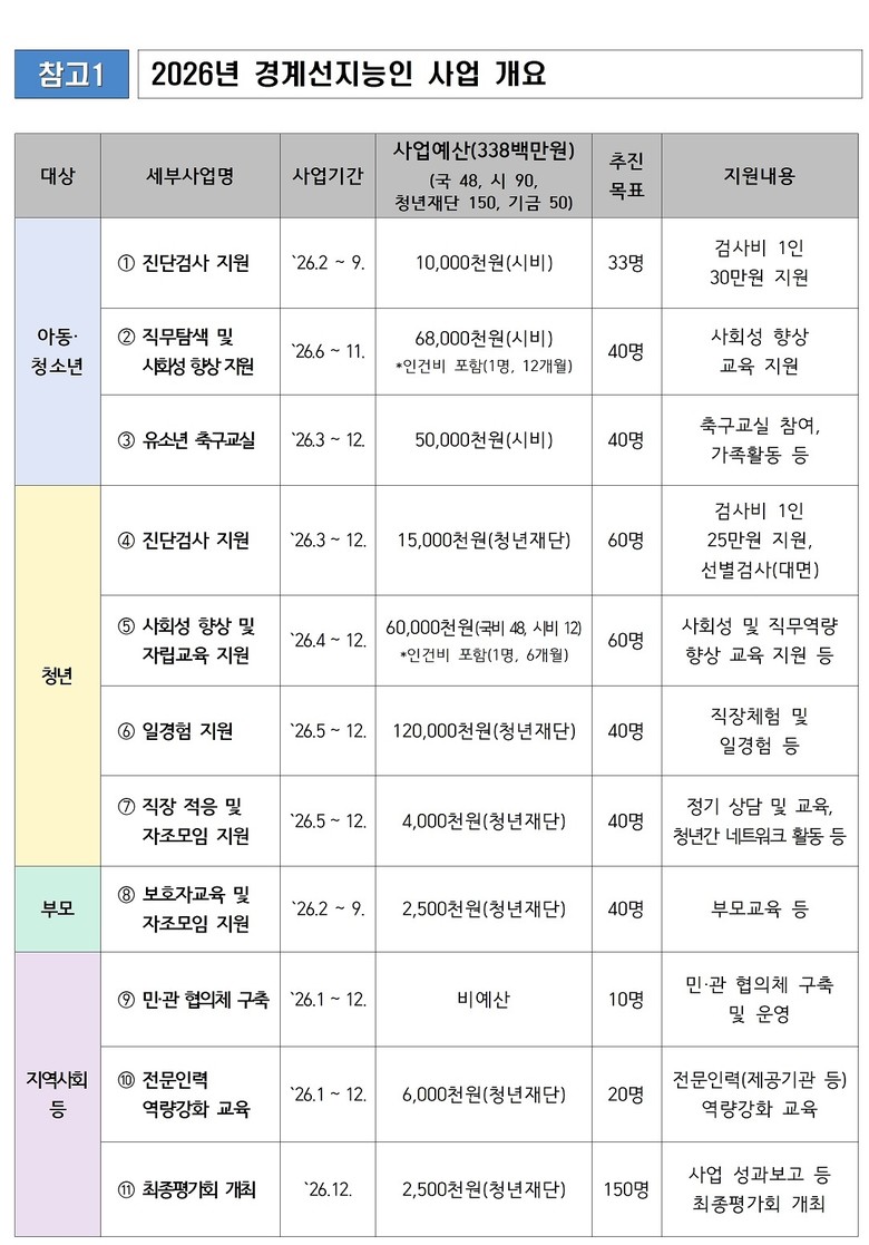 이에 앞서 시는 지난해부터 청년재단과 협업하여 경계선지능인 진단검사 지원과 진로탐색 및 사회성 향상 지원 사업에 이어 올해는 추가로 고용노동부 등과 협업하여 총예산 3억 3천8백만 원으로 지원사업을 확대 추진한다.