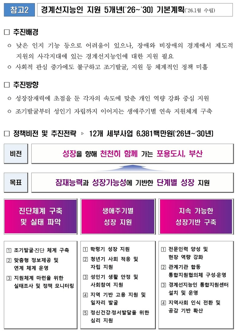 현재 10여 개의 법안이 국회에 계류 중인 상황에서 부산시는 앞서 2023년 「부산시 경계선지능인 지원에 관한 조례」를 제정하고, 올해 처음으로 5개년 기본계획을 수립하여 제도 사각지대가 없는 시민 모두가 건강하고 행복한 삶 실현을 위한 시의 정책의지를 담았다.