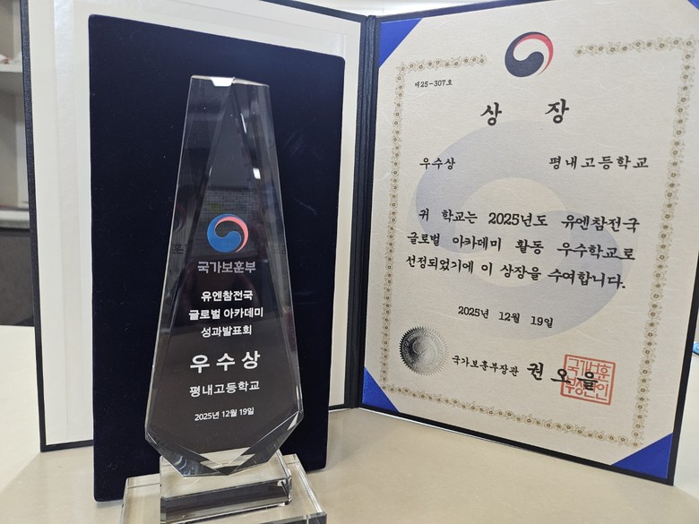 [남양주시 세계타임즈=송민수 기자] 평내고등학교(교장 이준호)가 지난 12월 19일 JW메리어트 동대문스퀘어 서울에서 개최된 '2025년 유엔참전국 글로벌 아카데미 성과발표회'에서 우수학교로 선정되어 국가보훈부 장관상을 수상했다.