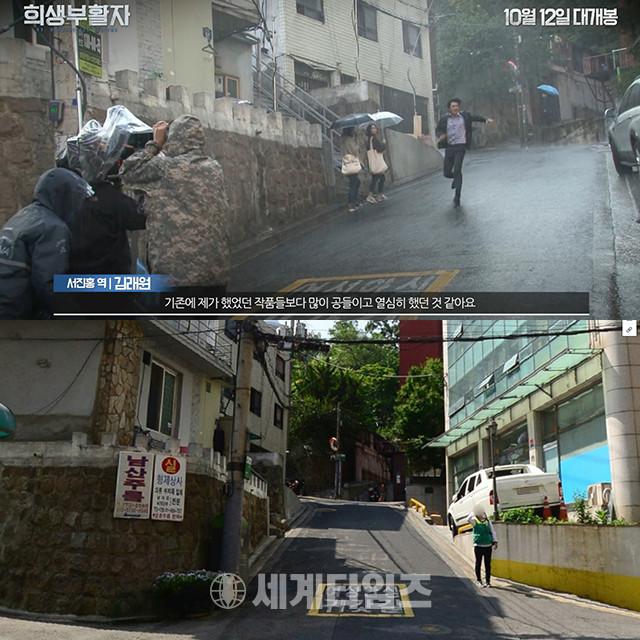 영화 '희생부활자' 제작 증언 영상에는 서울 중구 회현동1가에 위치한 엔포시즌 호텔 앞 여성안심 귀갓길 위를 뛰어가는 김래원의 모습이 공개됐다.