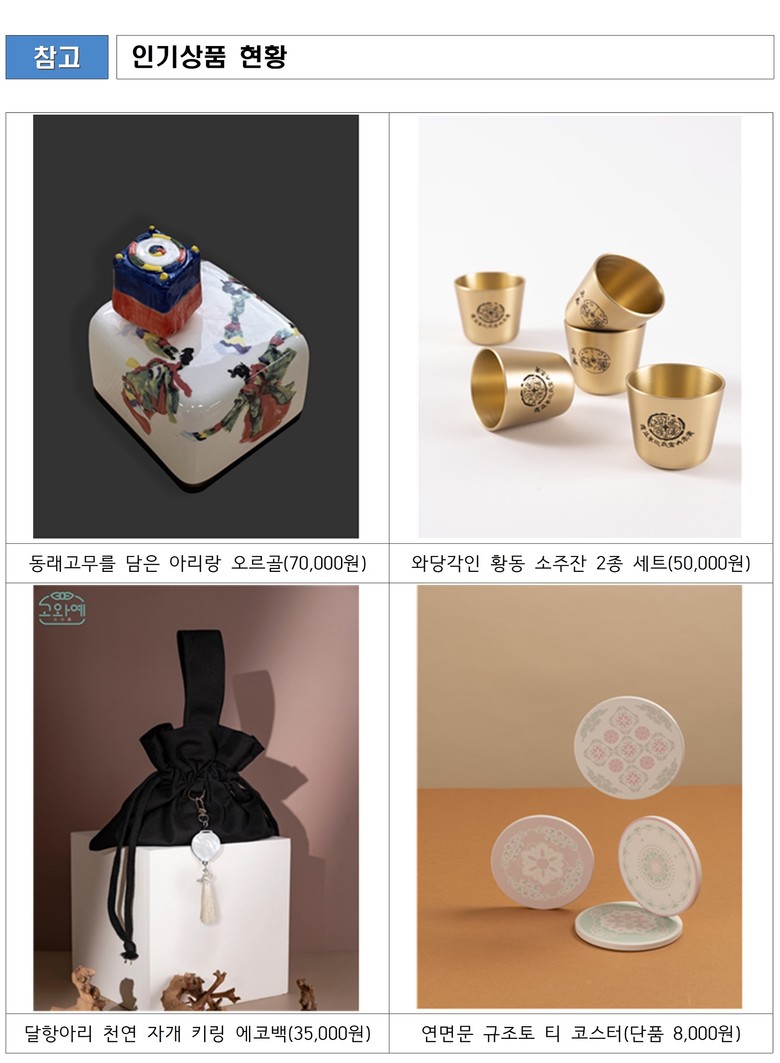 현재까지 총 56개의 상품을 개발했으며, 올해는 동래학춤을 모티브로 한 '갓 인센스 홀더(디퓨저)', 동래고무를 담은 '아리랑 오르골' 등 6개 신규 상품을 출시하며 제품군을 다양화했다.