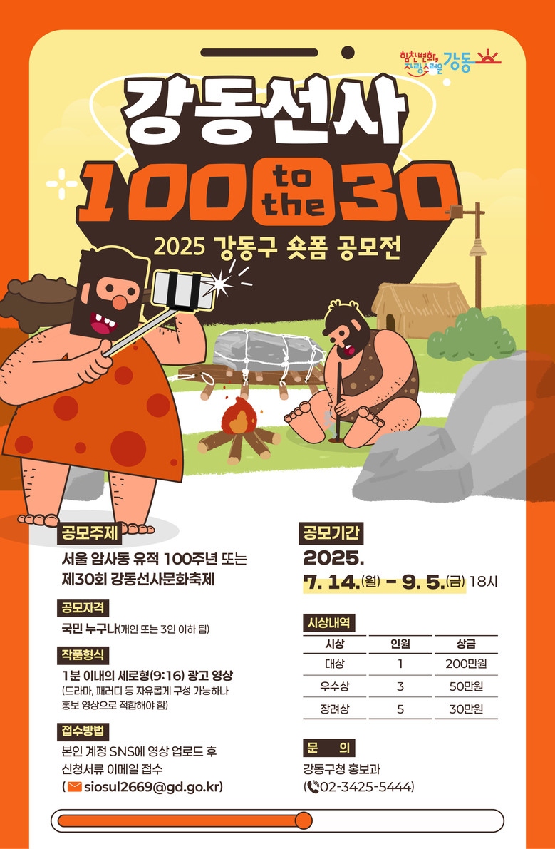 공모 주제는 ‘서울 암사동 유적 100주년’ 또는 ‘제30회 강동선사문화축제’ 중 하나를 선택하여 강동구의 역사적 가치와 지역 축제의 의미를 효과적으로 담은 광고 영상(1분 이내, 세로형)을 제작하면 된다. 드라마, 패러디 등 다양한 형식으로 응모할 수 있고, 개인 또는 팀 단위로 누구나 참여 가능하다.