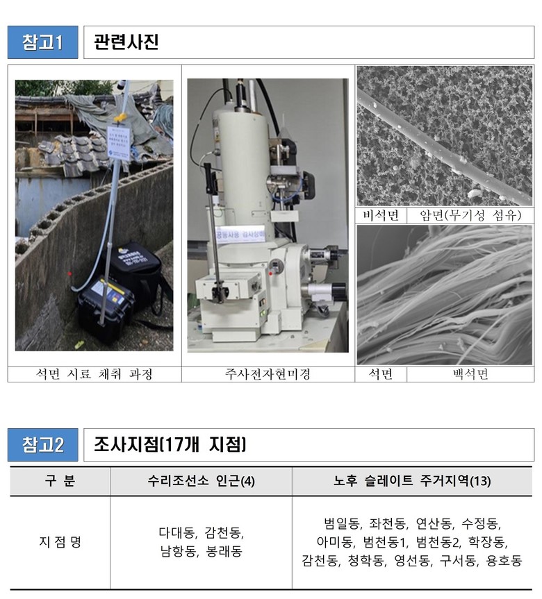 조사 대상은 수리조선소 인근 4지점과 주거용 노후 슬레이트 지역 12지점 등 총 16개 지점으로, 상·하반기 각 1회씩 연 2회 대기 중 석면 조사를 실시했다. 조사는 대기오염공정시험기준에 따라 공기포집 후 주사전자현미경법으로 분석되었다. 주사전자현미경법은 고배율 이미지와 화학 조성 분석을 통해 석면 여부를 정밀하게 판별하는 방법이다.