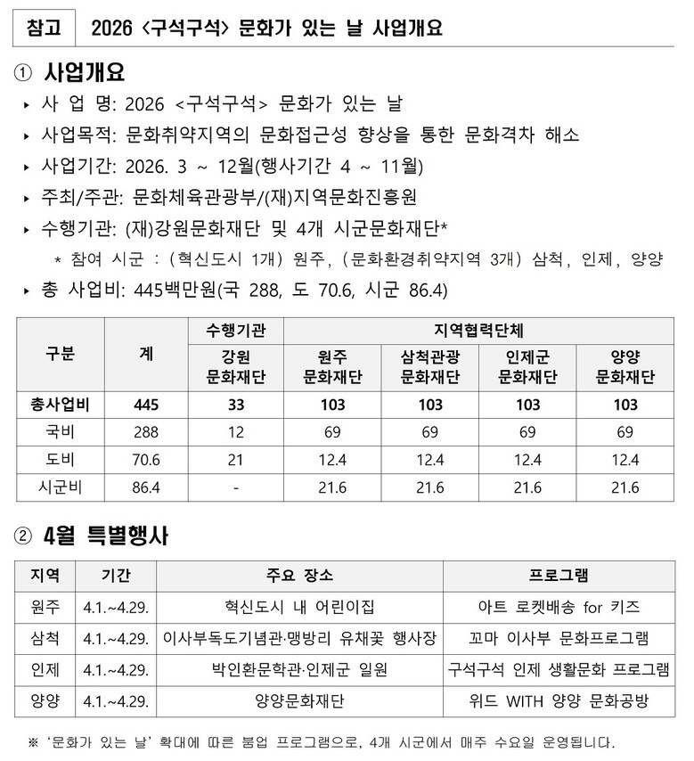 [강원도 세계타임즈=김민석 기자] 강원문화재단(대표이사 신현상)은 문화체육관광부와 강원특별자치도가 주최하고 지역문화진흥원이 주관하는 ‘2026 <구석구석> 문화가 있는 날’ 사업을 4월부터 본격 추진한다고 밝혔다.