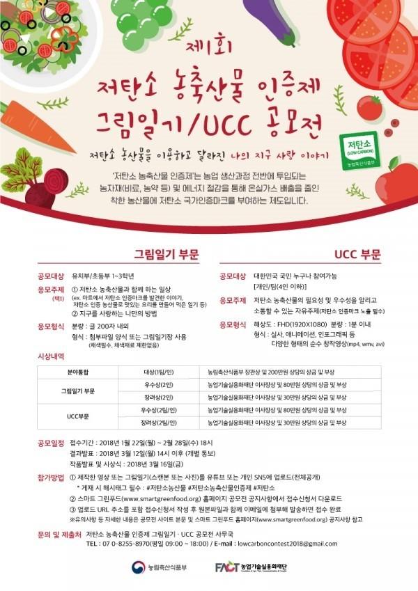 UCC는 저탄소 농축산물의 필요성 및 우수성을 알리고 소통할 수 있는 자유 주제로 개인 또는 팀(최대 4인) 자격으로 1분 이내 광고, 다큐, 드라마, 애니메이션 등 어떠한 형태로도 가능하다.