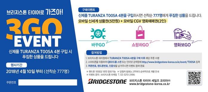 투란자 T005A 출시 기념 구매 이벤트는 2018년 4월 10일부터 시작되며, 투란자 T005A 타이어 4본을 구입하는 선착순 777명에게 5만원 상당의 모바일 백화점 상품권과 모바일 영화 예매권 2 매를 모두 증정한다. 이벤트는 선착순 777명 마감 시 종료된다. 자세한 문의사항은 이벤트 페이지참조하면 된다.
