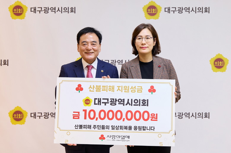 [대구 세계타임즈=한윤석 기자] 대구광역시의회(의장 이만규)는 영남지역 산불피해 지역 복구 및 이재민 지원을 위해 대구시의원과 직원들이 자율적으로 모금한 성금 1천만원을 4월 11일(금) 14시, 시의회 접견실에서 대구 사회복지공동모금회에 전달했다.