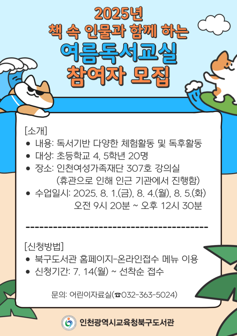 참가 신청은 7월 14일부터 북구도서관 누리집(https://lib.ice.go.kr/bukgu/index.do)에서 가능하며, 자세한 사항은 어린이자료실(032-363-5024)로 문의하면 된다.