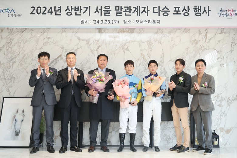[세계타임즈 = 송민수 기자] 3월 23일(토) 한국마사회(회장 정기환) 렛츠런파크 서울에서는 말관계자 다승달성 포상행사가 열렸다. 이번 포상은 작년 12월에서 올해 3월까지 다승과 첫 승을 달성한 3명의 말관계자에 대해 이루어졌다. 그 주인공은 통산 500승을 각각 달성한 박재우 조교사와 유승완 기수, 그리고 감격의 첫 승을 거둔 김성현 기수이다.
