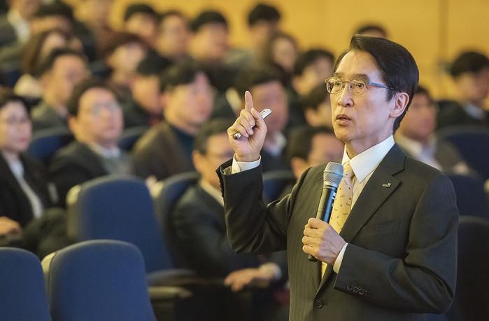 신 회장은 호루라기를 불기 앞서 지난해 경영성과를 짚어보고 올해 경영전략을 공유하는 강연을 펼쳤다. 50분 가량 이어진 강연에서 그는 올해 핵심 추진과제로 ‘상품 혁신’과 디지털 혁신’을 꼽았다.
